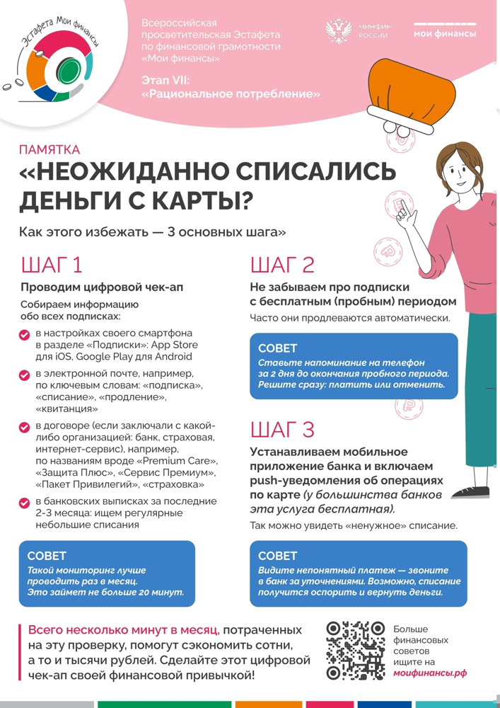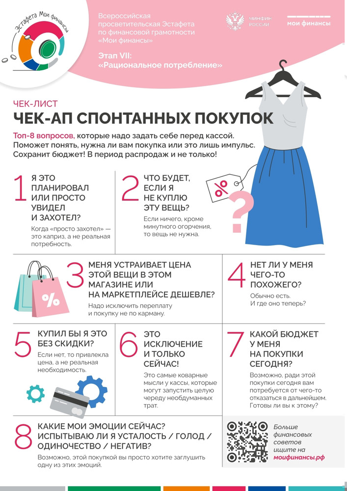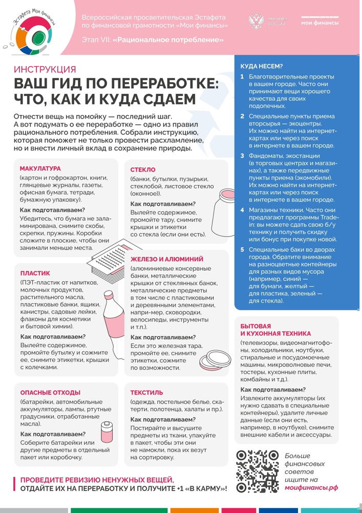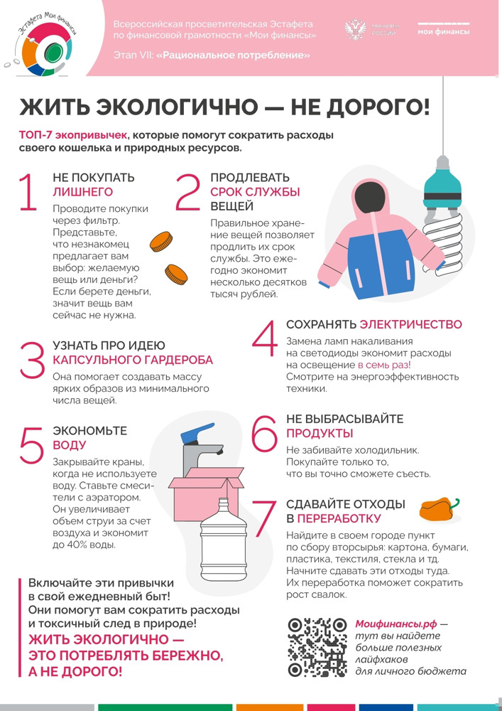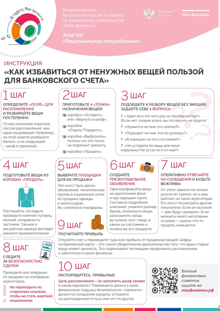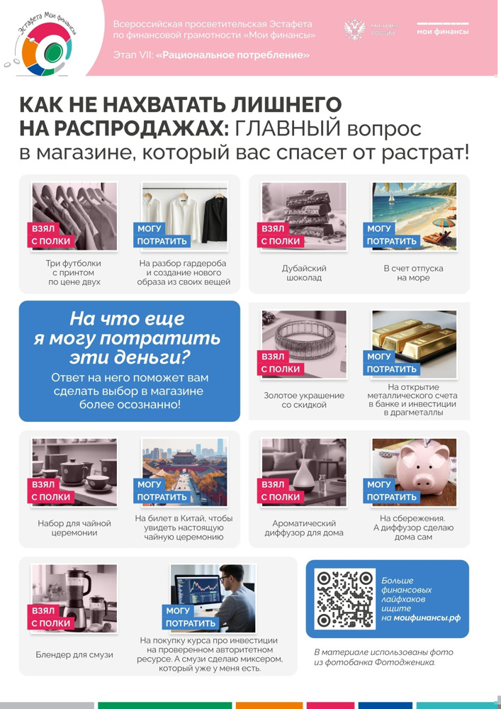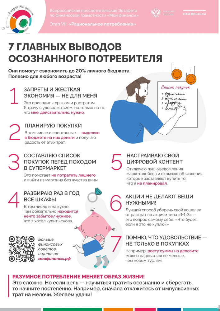С 19 ноября 2025 года по 10 февраля 2026 года проводится седьмой этап Всероссийской просветительской эстафет ы «Мои финансы», тема этапа – «Рациональное потребление». Материалы размещены в свободном доступе на образовательно-просветительском портале Моифинансы.рф